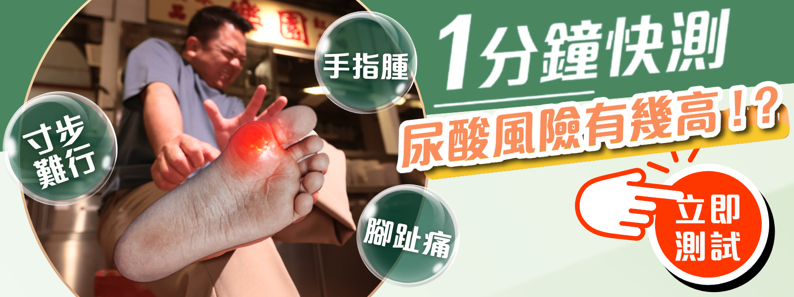 食得多、飲得多隨時會惹尿酸纏身!?日常飲食當中太多高嘌呤陷阱,一唔小心,隨時尿酸急升,關節痛瘋了!唔想尿酸愈積愈多,即刻用一分鐘測試自己尿酸風險有幾高!