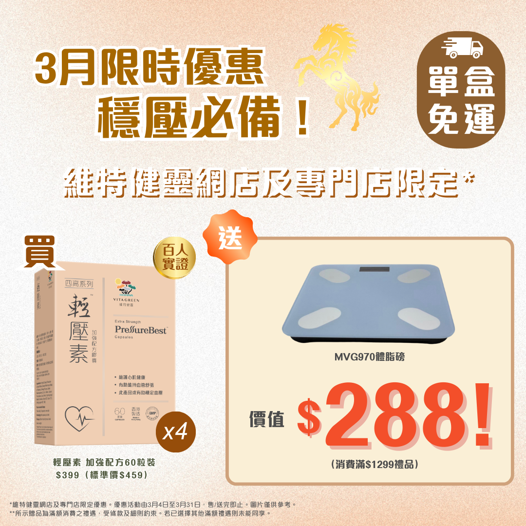 *維特健靈網店及專門店限定優惠。優惠活動由3月4日至3月31日,售/送完即止。圖片僅供參考。